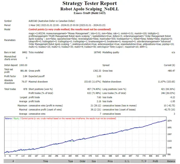 ROBOT APOLO SCALPING MT4 is a thoughtfully designed trading assistant developed for the MetaTrader 4 (MT4) platform. It utilizes advanced adaptive algorithms and live data analysis to identify exact entry and exit points, supporting both scalping and day trading methods with exceptional precision. During backtesting, this EA demonstrated a maximum drawdown of only 11.67% and consistent profits on currency pairs like AUDCAD, GBPUSD, and EURUSD in 2023.
