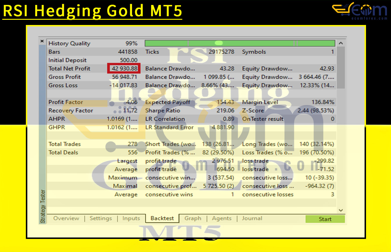 The RSI Hedging Gold EA demonstrates robust profitability and disciplined risk control, reflecting a well-balanced blend of technical precision and hedging protection. In this backtest, starting from a modest $500 deposit, the EA achieved significant gains while maintaining manageable drawdowns, confirming its effectiveness for gold (XAUUSD) trading on short timeframes.