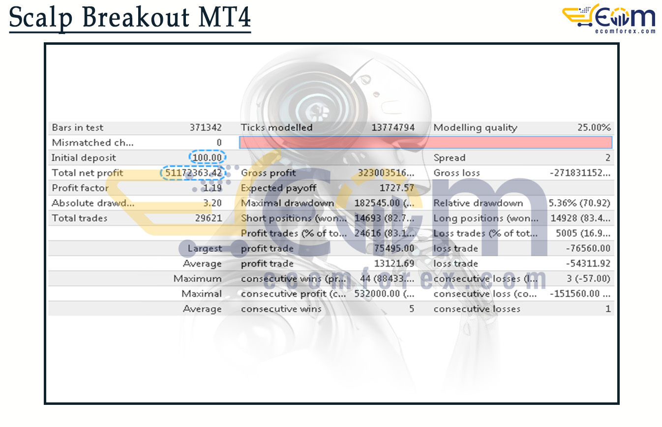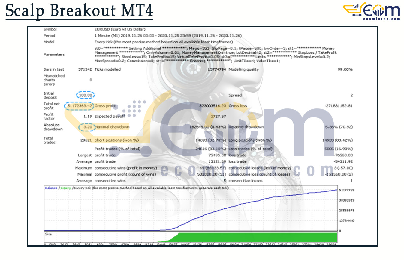 Scalp Breakout MT4 delivered strong long-term profitability on this intensive 1-minute EURUSD backtest, maintaining a steady and controlled equity curve despite the high-frequency trading environment.