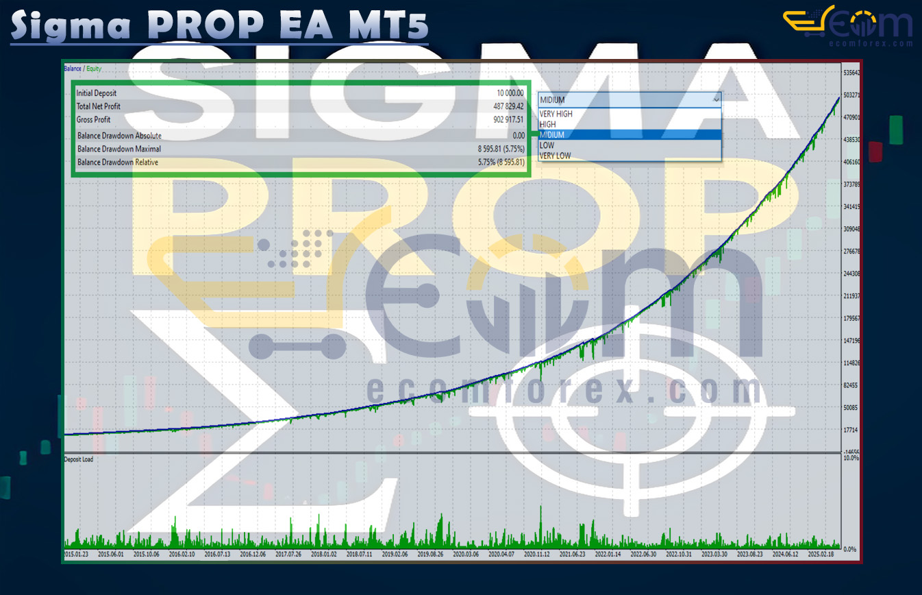 Sigma PROP EA has demonstrated powerful long-term profitability and outstanding consistency throughout a 10-year backtest period (2015–2025) under medium-risk settings.