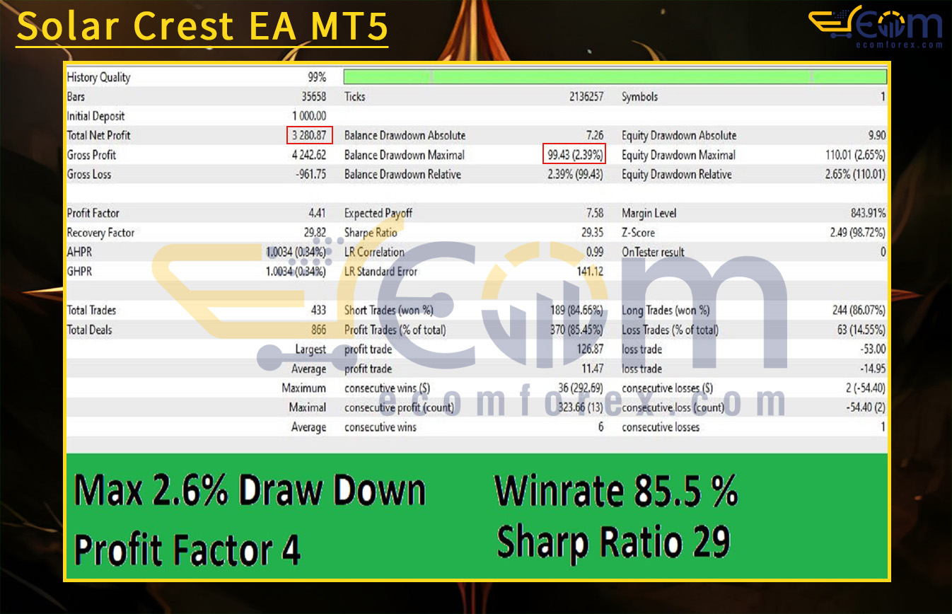 The Solar Crest EA demonstrates steady profitability and strong discipline in risk management, showcasing its ability to combine consistent performance with controlled drawdowns. In this backtest, starting from a $1,000 deposit, the system delivered reliable equity growth while keeping risk exposure minimal.