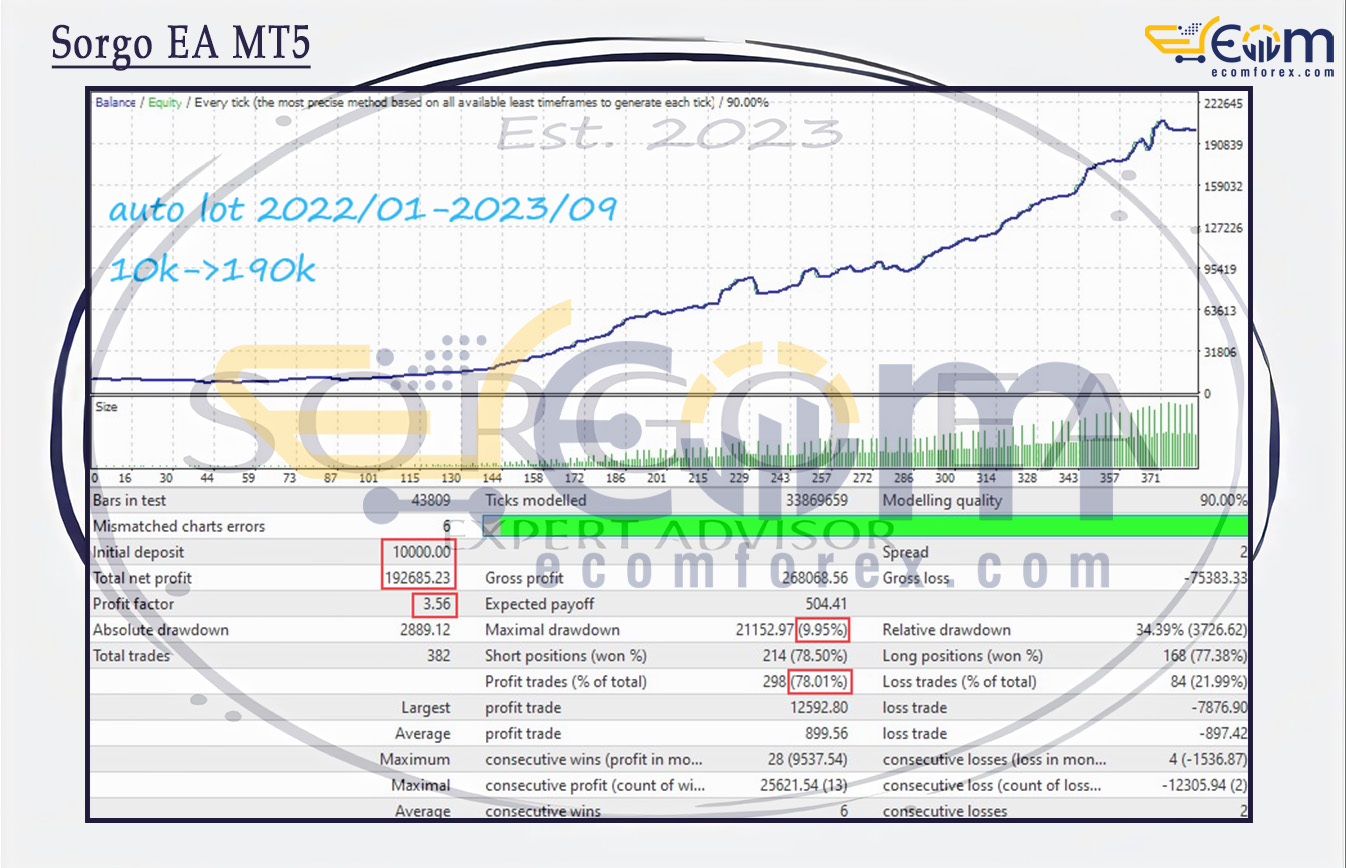 Total Net Profit : $192,685.23 Win Rate : 78.01% Maximum Drawdown : 9.95% Sorgo EA MT5 Backtests Recommended Configuration for Sorgo EA MT5 Name Fit Trading platform Meta Trader 5 (MT5) Time frames M15 (15 minute chart) Currency pairs EURUSD Min / Recommended deposit $100 Min / Recommended leverage 1:100 up to 1:500 VPS Optional, for uninterrupted advisor operation.