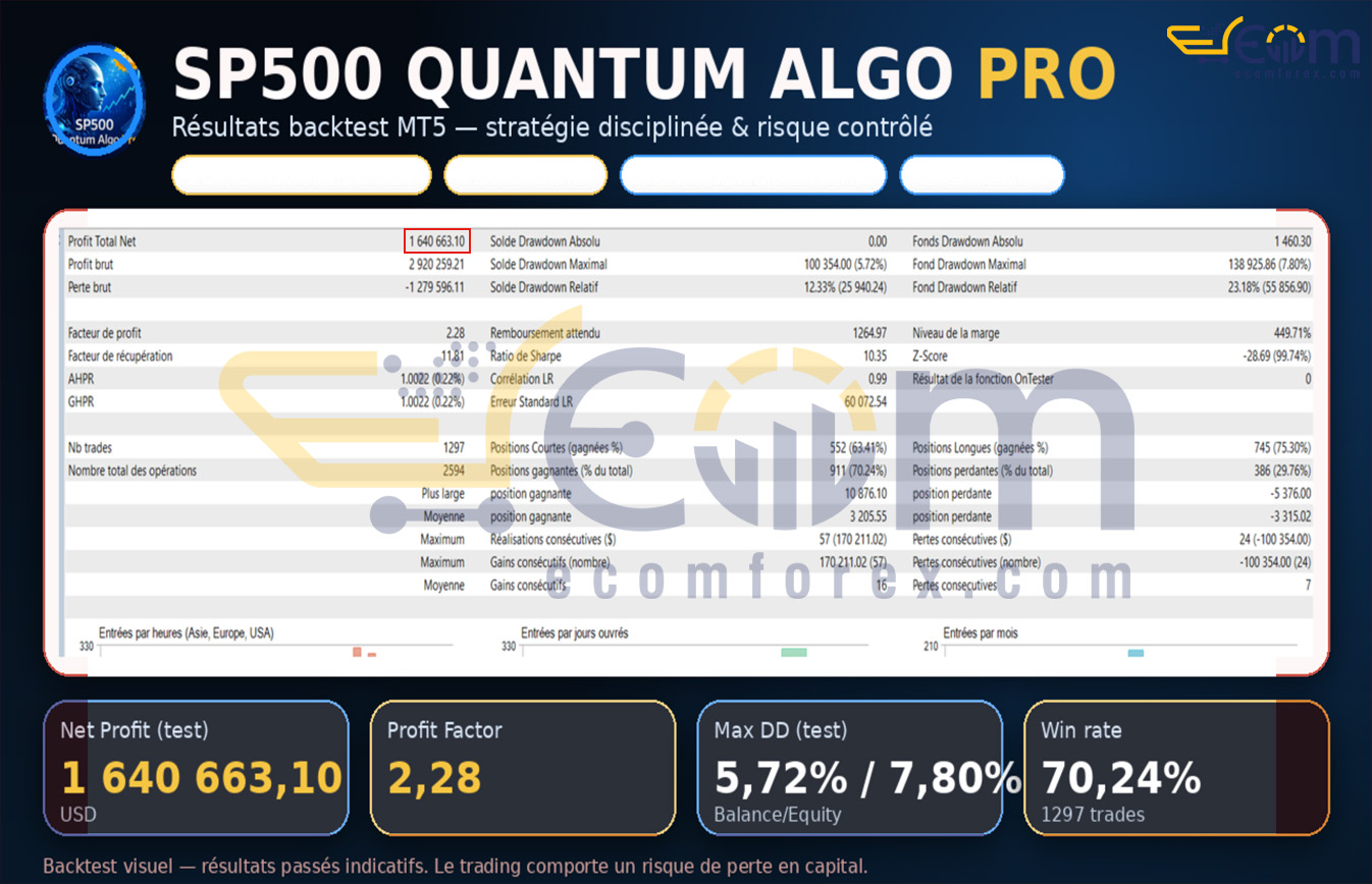 With 20+ years across indices, forex, and equities, I view SP500 Quantum Algo Pro MT5 as one of the most professional MT5 Expert Advisors dedicated solely to the S&P 500 (US500 / SPX / SP500Cash). No generic multi-symbol bot, no martingale/grid recklessness—just selective, high-conviction trades built for capital preservation in a liquid, trend-capable index.