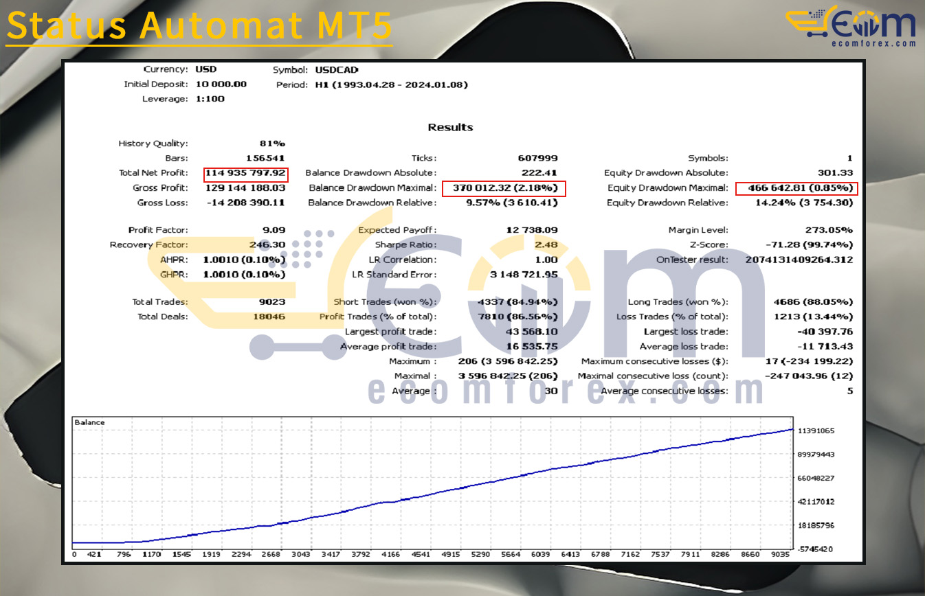 Status Auto EA MT5 has been extensively backtested for more than 30 years (April 1993 – January 2024) on the USDCAD pair (H1 timeframe), demonstrating its ability to deliver exceptional long-term profitability, precision, and strong risk control. Starting with a $10,000 initial deposit, the EA generated impressive growth while keeping drawdown remarkably low.