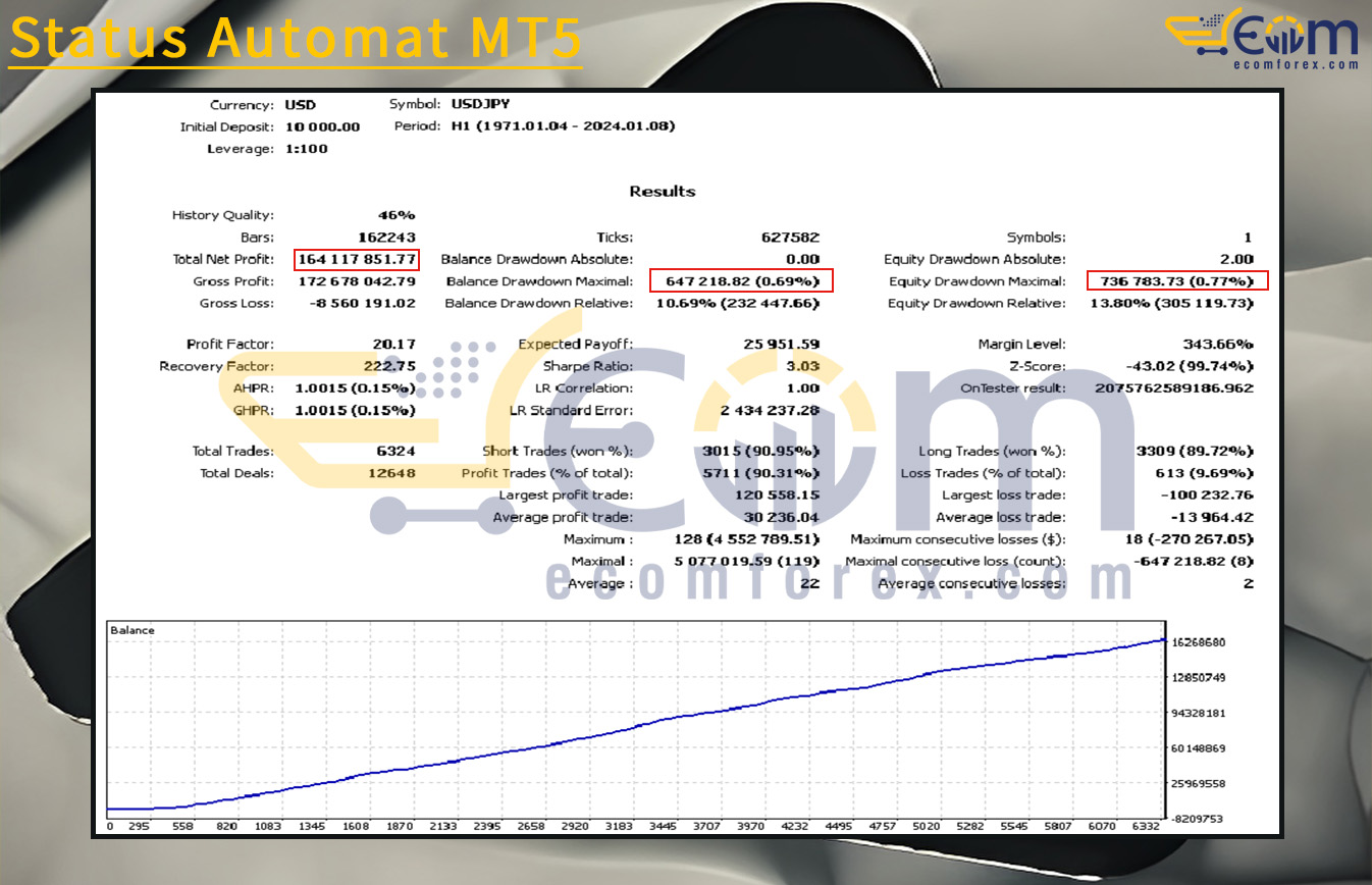 Status Auto EA MT5 has been extensively backtested for more than 50 years (January 1971 – January 2024) on the USDJPY pair (H1 timeframe), demonstrating its ability to deliver outstanding long-term profitability, precision, and strong capital protection. Starting with a $10,000 initial deposit, the EA achieved remarkable multi-million growth while maintaining exceptionally low drawdown.