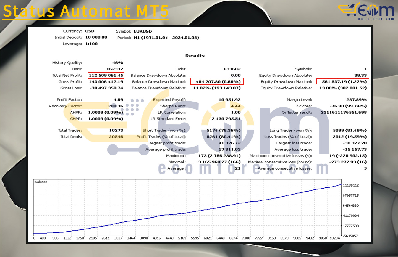 Status Auto EA MT5 has been extensively backtested for more than 50 years (January 1971 – January 2024) on the EURUSD pair (H1 timeframe), showcasing its ability to deliver exceptional long-term profitability, precision, and robust risk management. Starting with a $10,000 initial deposit, the EA achieved extraordinary growth while maintaining a very low drawdown.