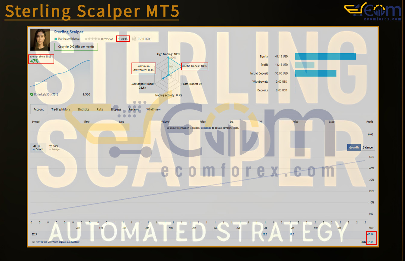 In its first week of live execution, Sterling Scalper MT5 delivered outstanding performance and flawless risk control, turning a modest $30 account into a +47.1% gain with zero meaningful drawdown.