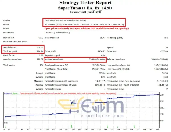The Super Yumnaa EA was tested on the GBPUSD pair using the M30 timeframe, covering the period from January 1, 2024, to June 13, 2024. Starting with an initial deposit of $1,000, the EA achieved a total net profit of $1,796.94, resulting in a profit factor of 5.75, indicating high trading efficiency.