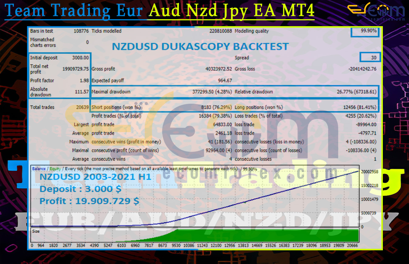 Team Trading Eur Aud Nzd Jpy EA MT4 delivered exceptional long-term profitability in this NZDUSD backtest, maintaining a smooth and consistently rising equity curve over the full 18-year H1 testing period.