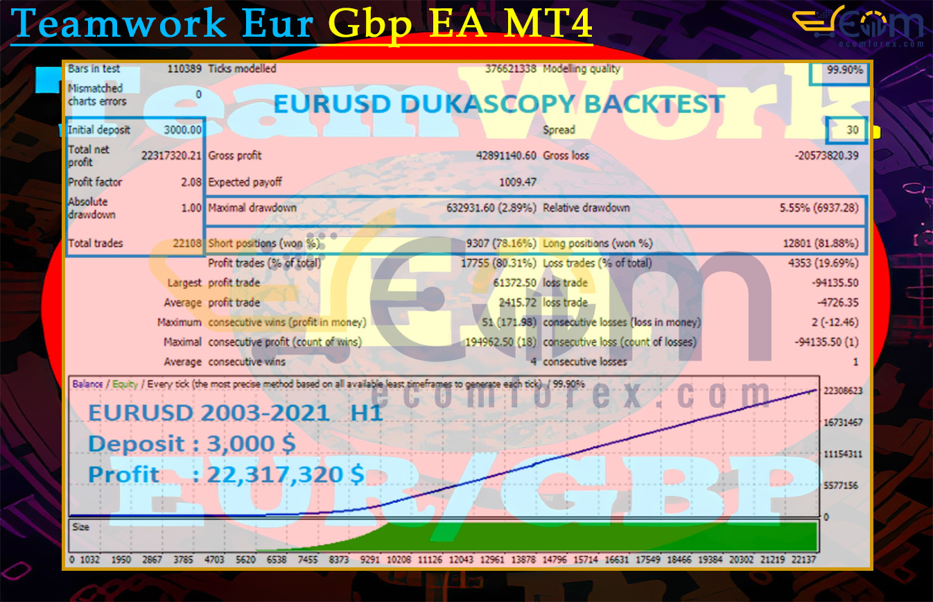 Teamwork Eur Gbp EA MT4 delivered strong long-term profitability in this EURUSD backtest, maintaining a smooth and controlled equity curve across an 18-year H1 testing period.