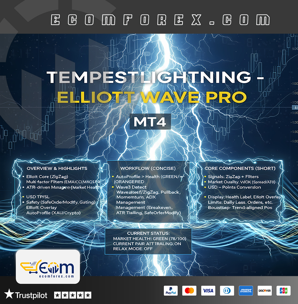 TempestLightning Elliott Wave Pro MT4 is a professional-grade MT4 Expert Advisor (EA) built upon Elliott Wave theory, designed to identify high-probability wave structures and capture powerful wave-3 moves.