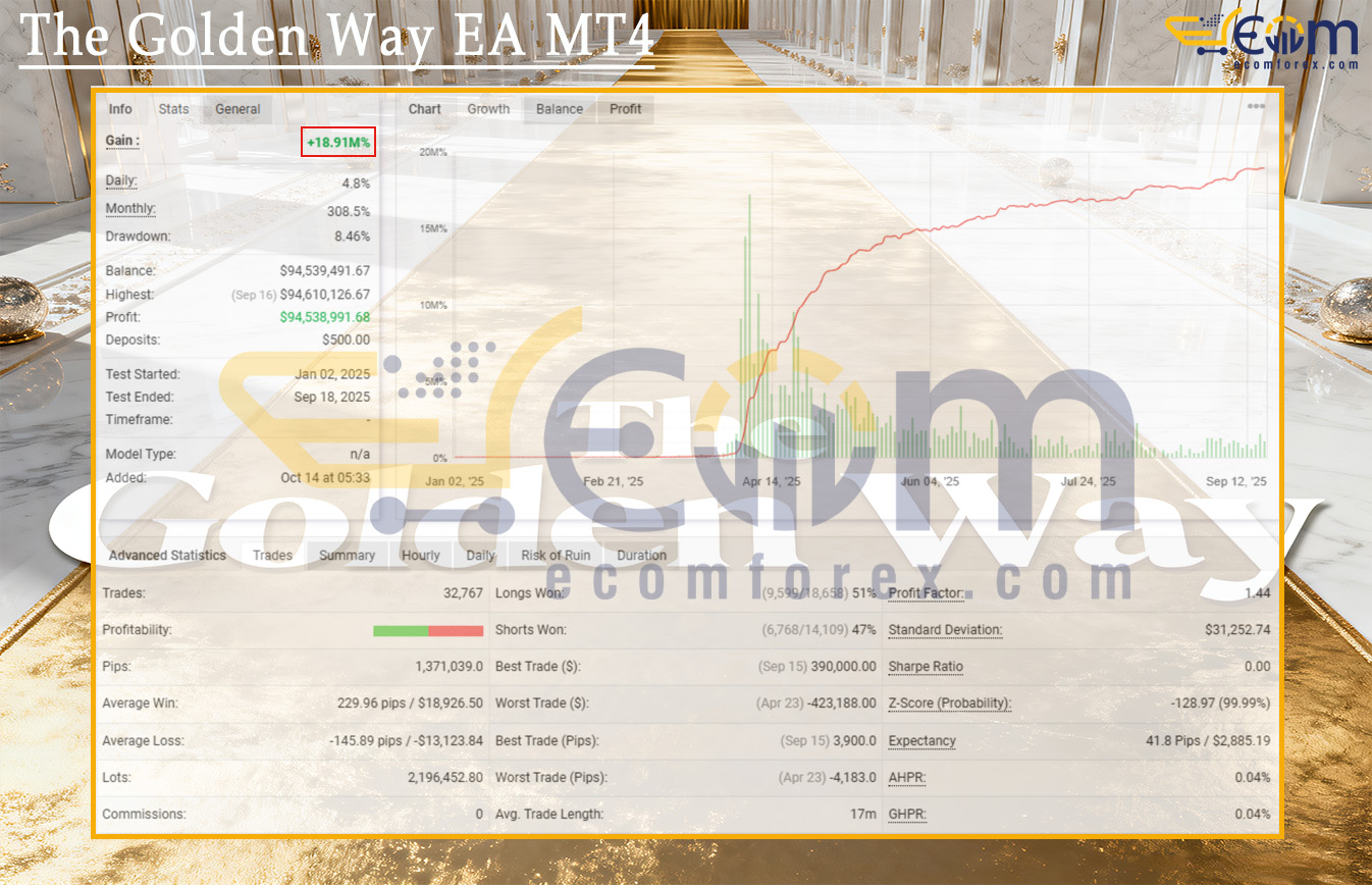 The Golden Way EA MT4 has demonstrated outstanding live performance on XAUUSD, achieving verified explosive growth with an astonishing +18,919% gain over an 8.5-month period from January to September 2025, while maintaining moderate drawdown and smooth upward equity curve, confirming the power and adaptability of its hybrid strategy in real market conditions.