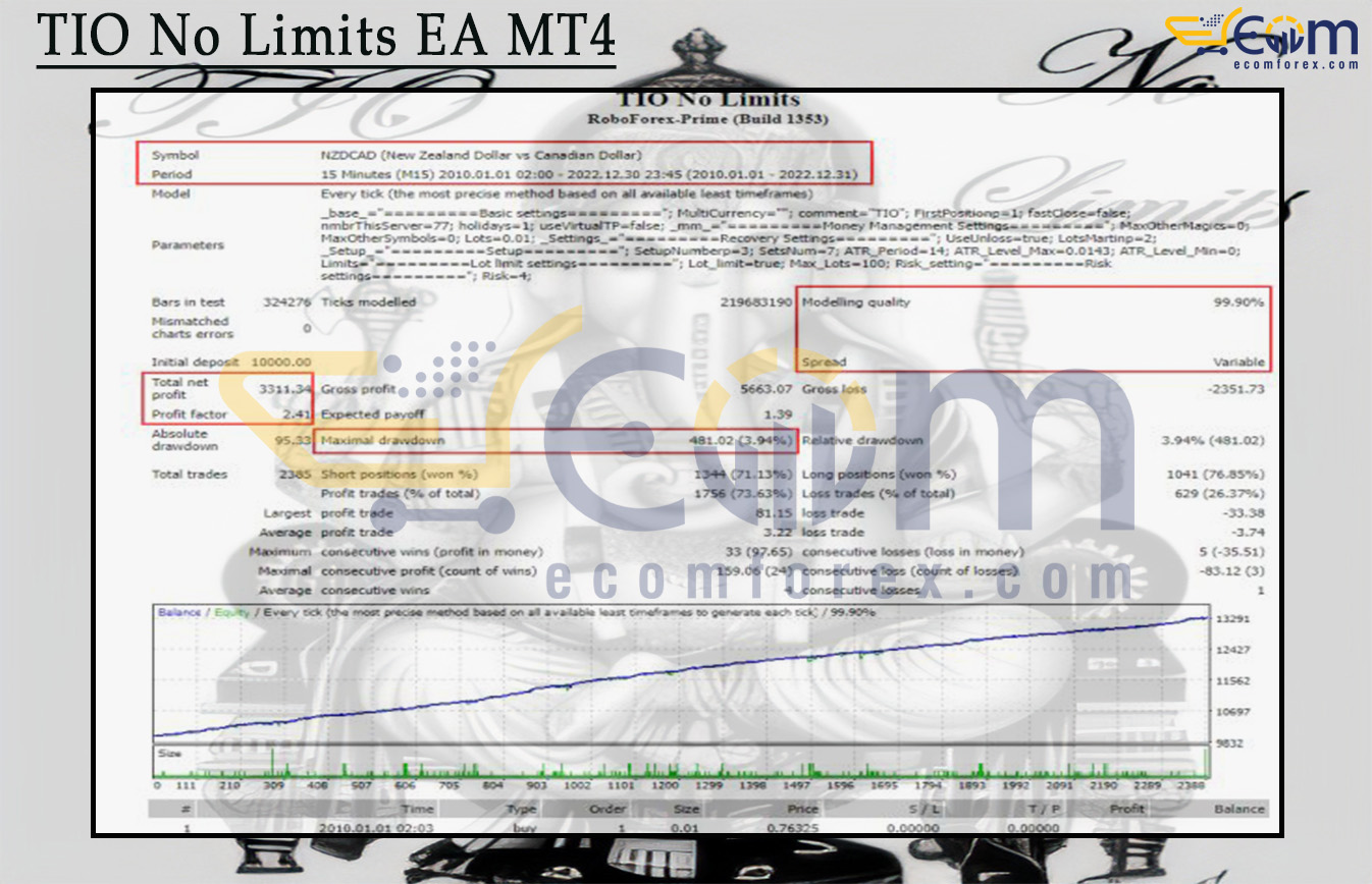 TIO No Limits EA delivered solid long-term profitability in a high-quality backtest spanning over 12 years (January 1, 2010 – December 31, 2022) on the NZDCAD pair (M15 timeframe), demonstrating reliable performance with consistent compounding and well-managed drawdown in a cross-pair environment.