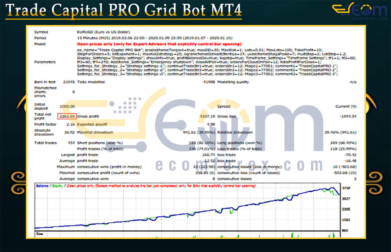 Trade Capital PRO Grid Bot MT4 demonstrated consistent profitability over a one-year backtest on the EURUSD pair, operating on the M15 timeframe under controlled execution conditions. The system achieved steady account growth through active trade frequency while maintaining structured order management.