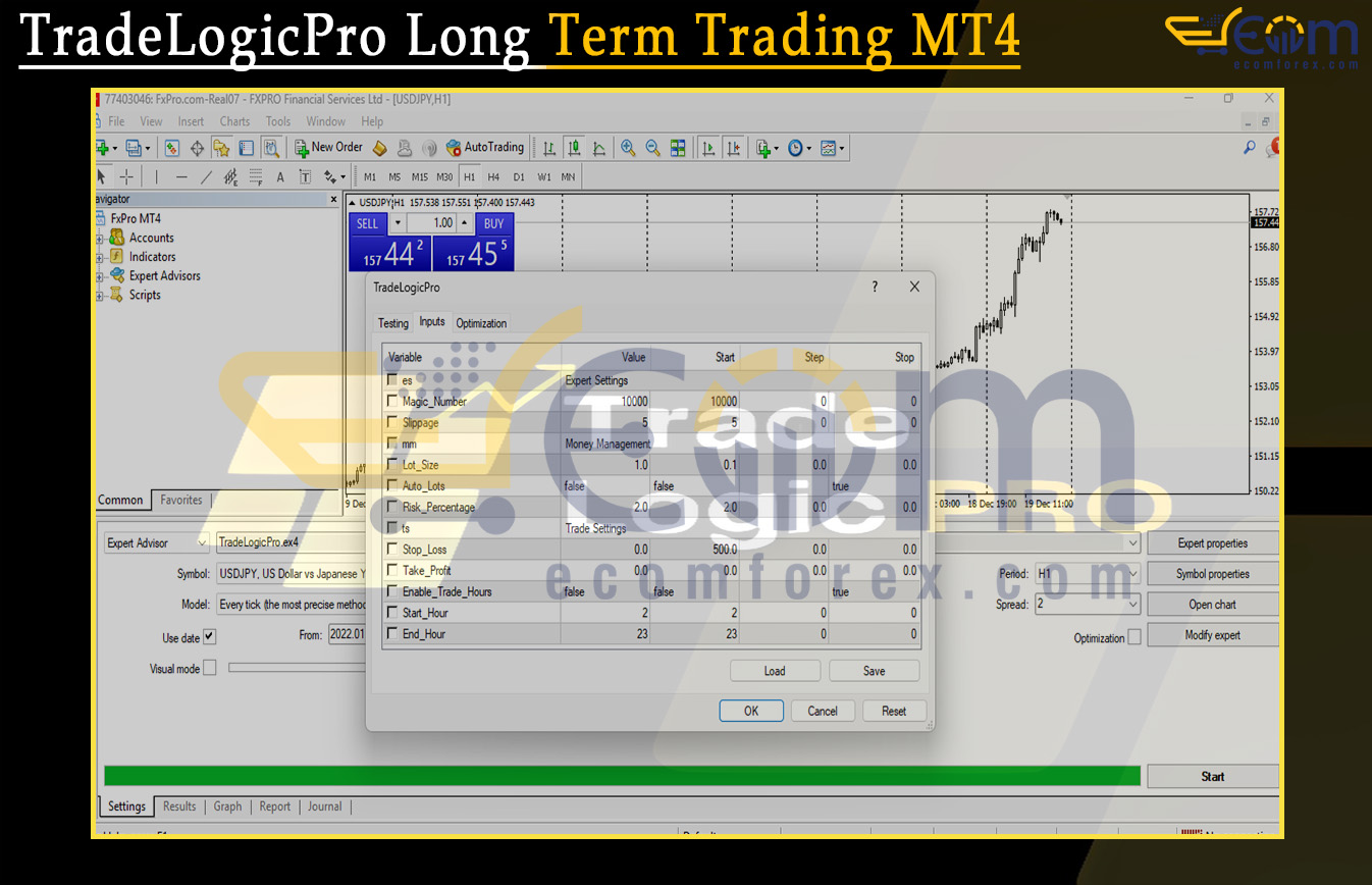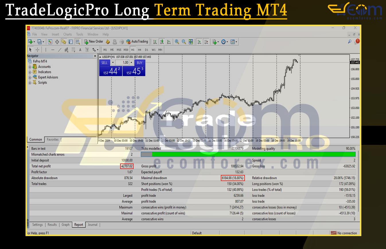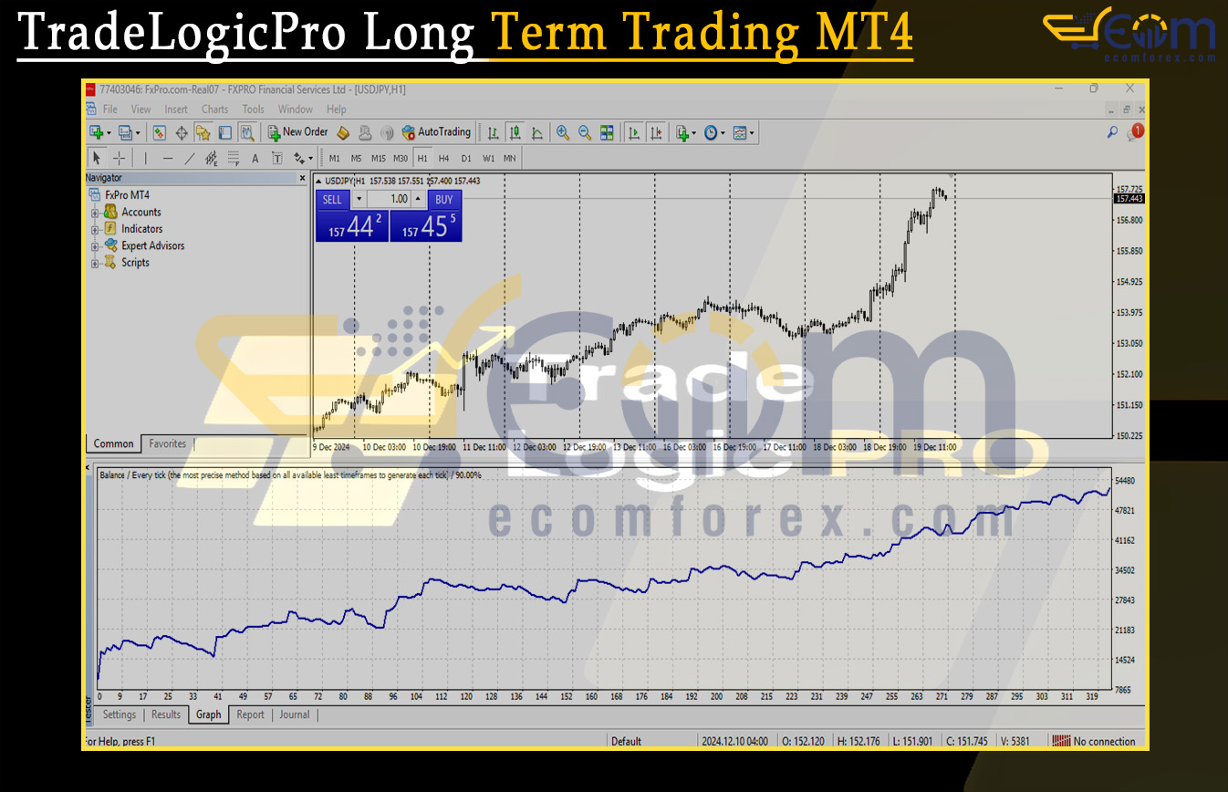 TradeLogicPro Long Term Trading MT4 delivered consistent and disciplined profitability during this USDJPY H1 backtest, maintaining stable growth while controlling risk throughout the entire testing period.