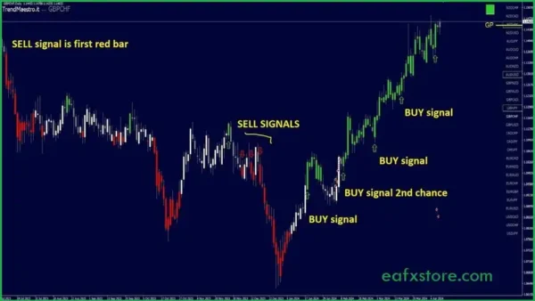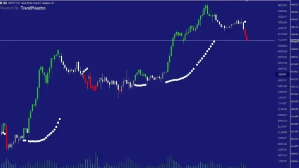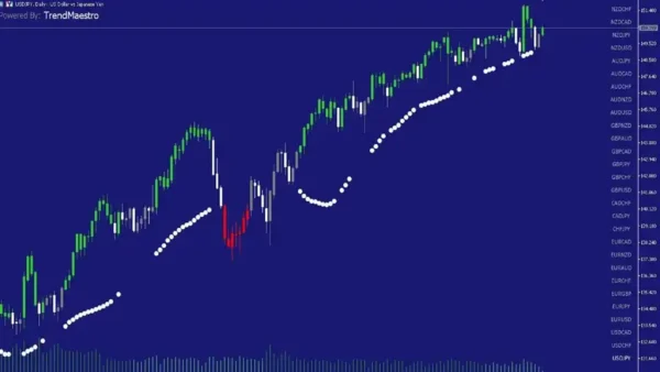 The TrendMaestro Indicator is a tool specifically formulated for the MT4 platform. This tool excels in recognizing robust market trends, assessing levels of volatility, volume, and momentum to ascertain when a new trend is emerging.
