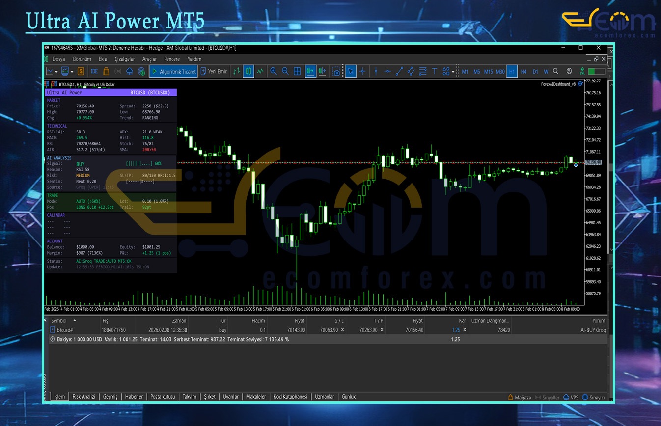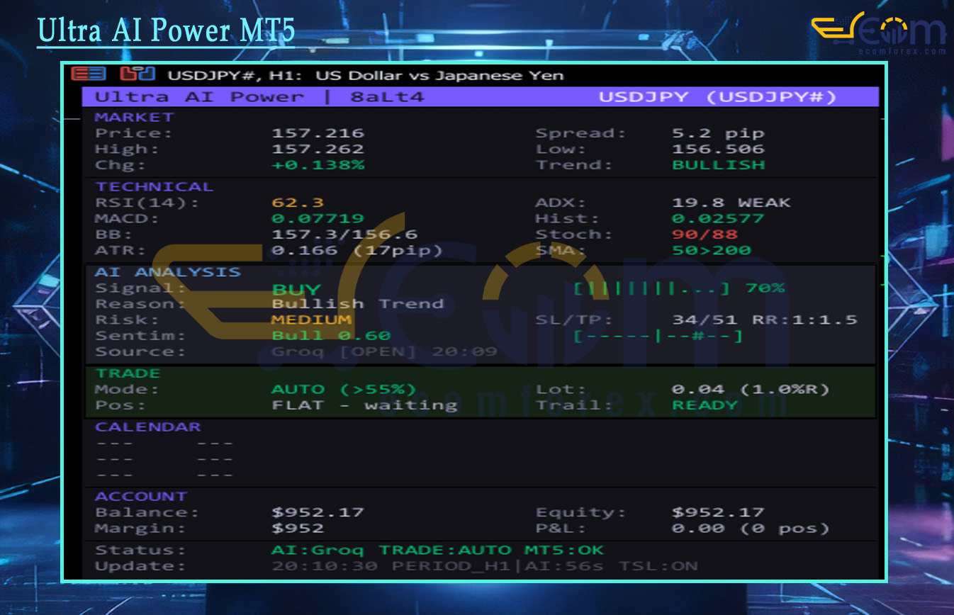 With over 20 years of experience in the markets, I rate Ultra AI Power MT5 as a truly innovative and intelligent Expert Advisor (EA) for MetaTrader 5 (MT5). This EA stands out by combining real-time technical analysis from multiple classic indicators with the analytical power of advanced AI models (Groq Llama 3.3 70B as primary, with Gemini as backup), delivering clear BUY/SELL/HOLD signals directly on the chart along with confidence levels, suggested SL/TP, and reasoning.