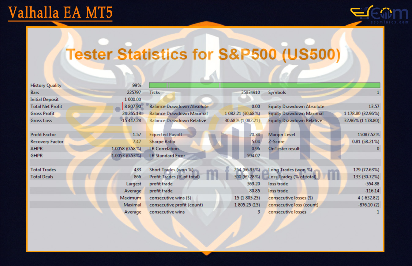 Valhalla EA delivered strong and consistent profitability over this high-quality backtest on the S&P 500 (US500) index, powered by its volatility spike momentum model that effectively captures and rides intraday impulse moves. The system achieved solid returns with a healthy profit factor, excellent recovery strength, and well-managed drawdown relative to the momentum style, backed by near-perfect modeling quality (99%).