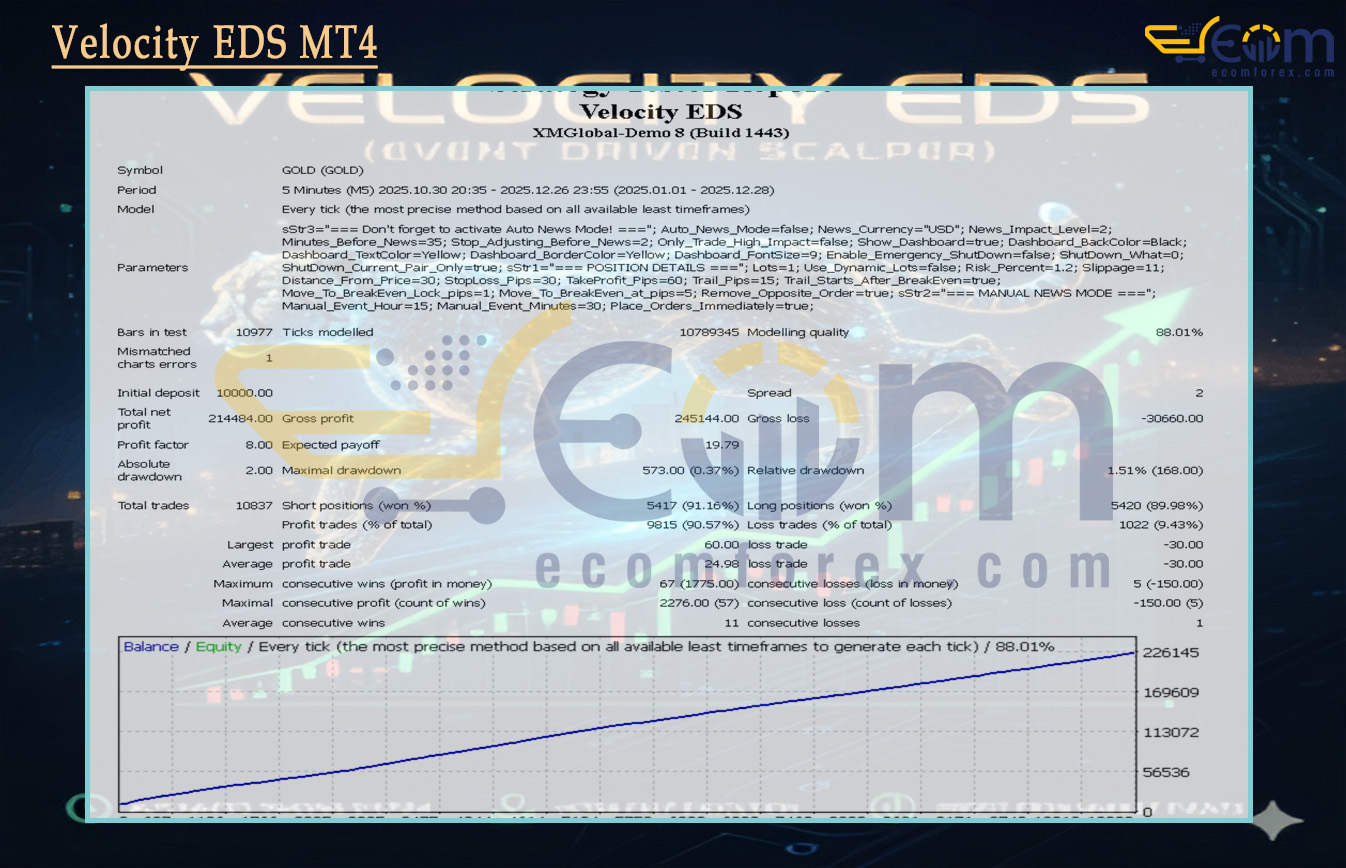 With over 20 years of experience trading around high-impact economic events, I rate Velocity EDS MT4 as a sophisticated and well-engineered Expert Advisor (EA) specifically built for news trading on MetaTrader 4 (MT4). This EA is designed to capitalize on the sharp volatility spikes that occur during major economic announcements, making it one of the most specialized news trading systems available.