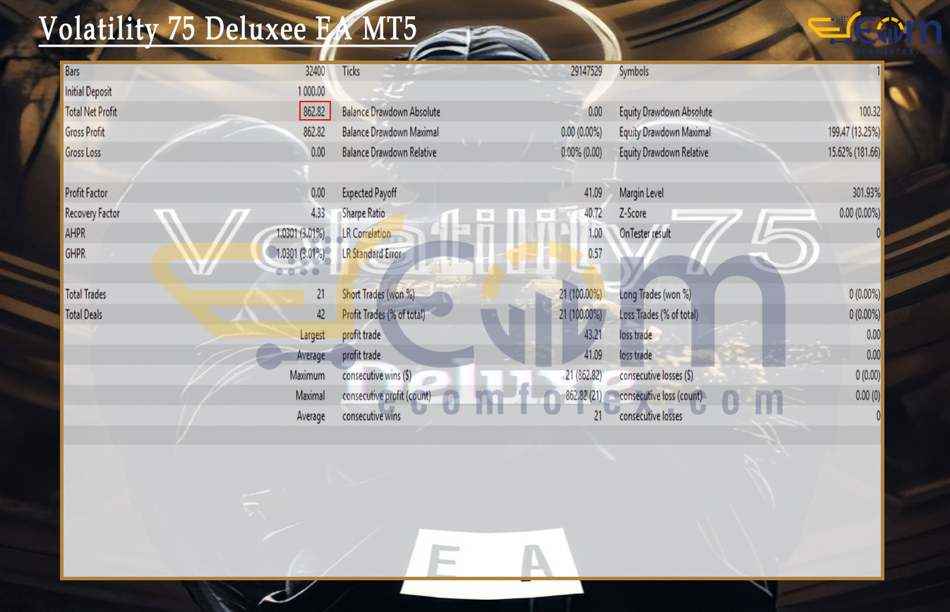 With over 20 years of experience trading high-volatility indices on Deriv, I rate the Volatility 75 Deluxee EA MT5 as a well-optimized MT5 Expert Advisor (EA) specifically designed for the Volatility 75 Index on the M30 timeframe.