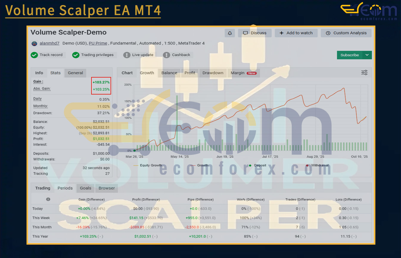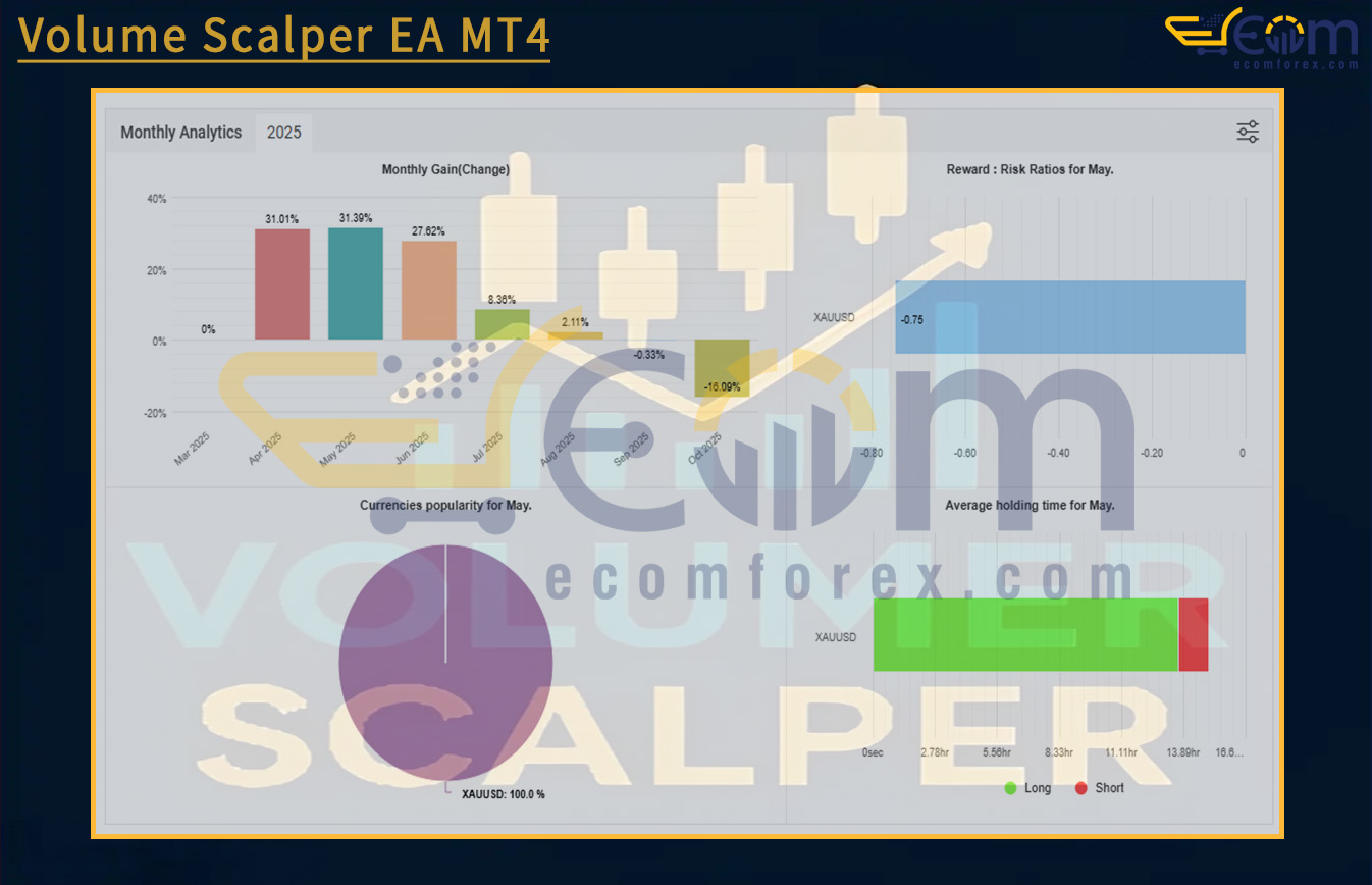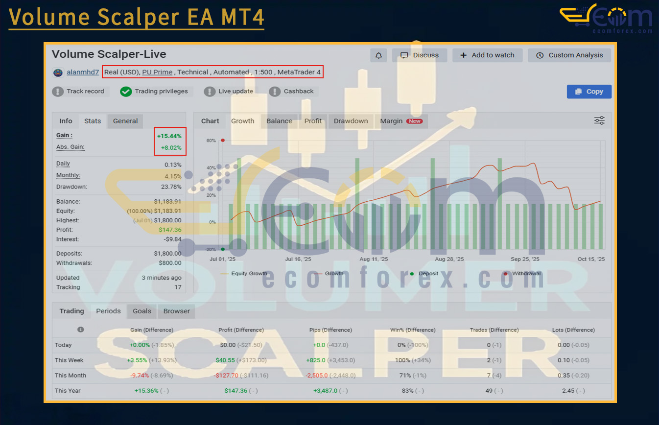 Volume Scalper EA has demonstrated verified, consistent profitability on Myfxbook over a 4-month live tracking period — showcasing its ability to grow capital steadily while maintaining controlled risk exposure and disciplined performance.