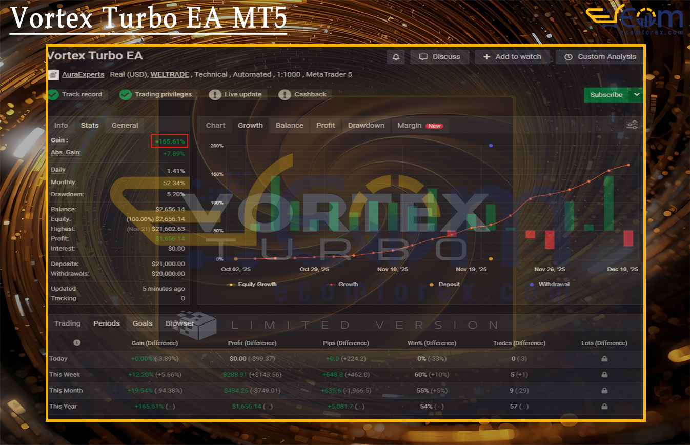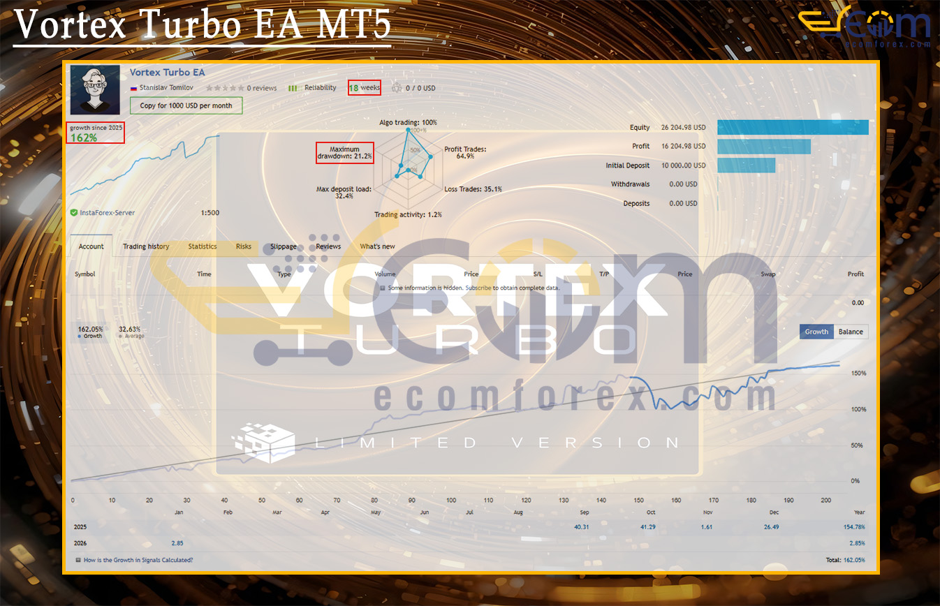 Vortex Turbo EA MT5 is an advanced and powerful automated trading Expert Advisor (EA) designed to optimize performance with XAUUSD (GOLD) on the H1 timeframe. Its trading performance has been verified by MyfxBook.