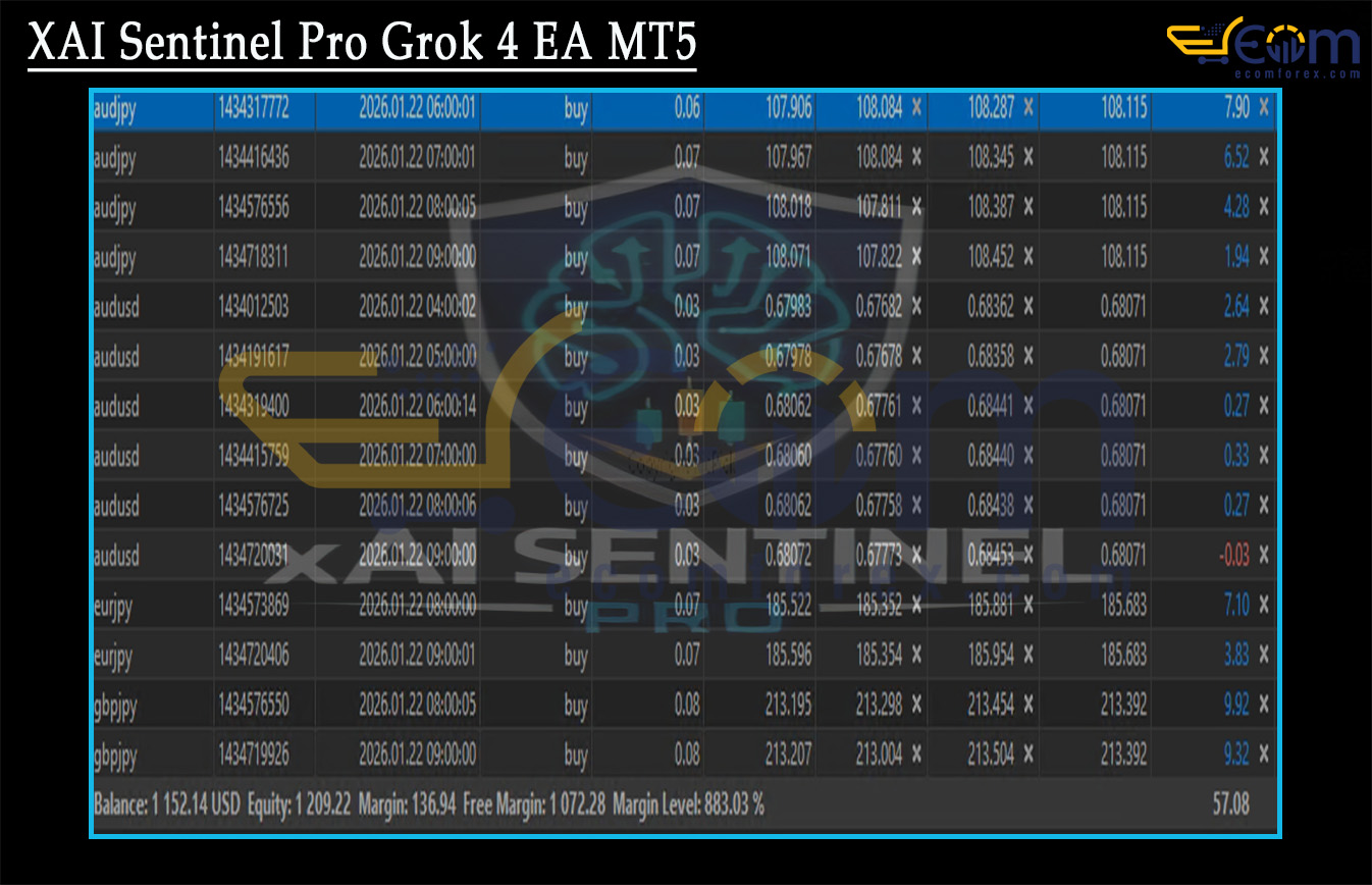 Multi-Market Versatility Built-In XAI Sentinel Pro Grok 4 EA is engineered to perform reliably across major Forex pairs, XAUUSD (gold), and select high-liquidity cryptocurrencies — all from a single chart.