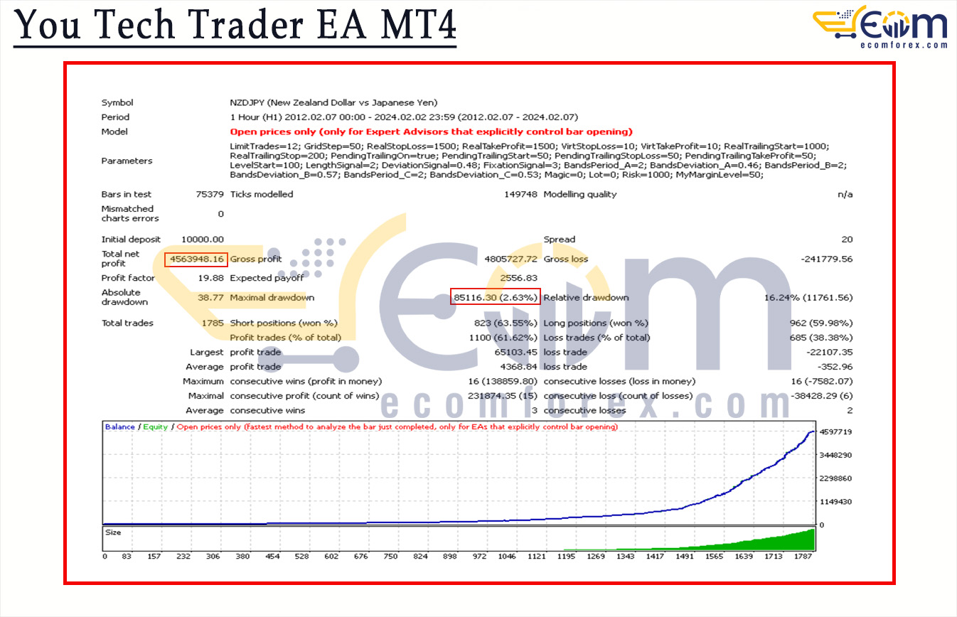 You Tech Trader EA MT4 showed another strong performance in this 12-year backtest on the NZDJPY H1 timeframe, maintaining a smooth, consistently rising equity curve with controlled drawdown.