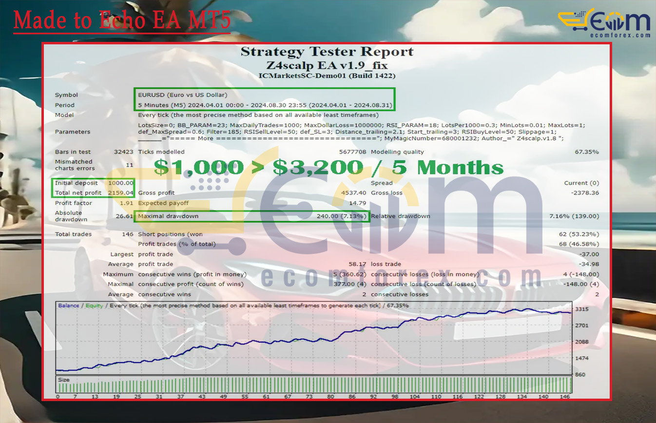Z4scalp EA underwent rigorous historical testing on the EURUSD pair using the M5 timeframe, covering a solid 5-month modeling period from April 2024 to August 2024. Starting with a realistic $1,000 initial deposit, the EA delivered outstanding results that showcase its precision, consistency, and superior risk management.