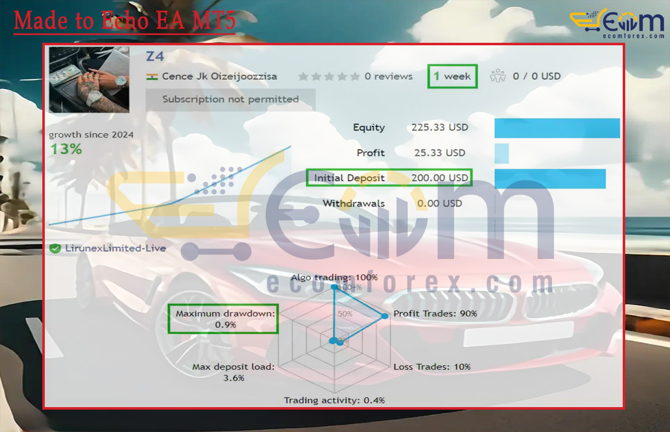Z4scalp EA has demonstrated strong, verifiable results in live trading conditions. Starting with a modest $200 initial deposit, the EA generated an impressive +12% profit in just one week of continuous operation — all while maintaining an exceptionally low maximum drawdown of only 0.9%.
