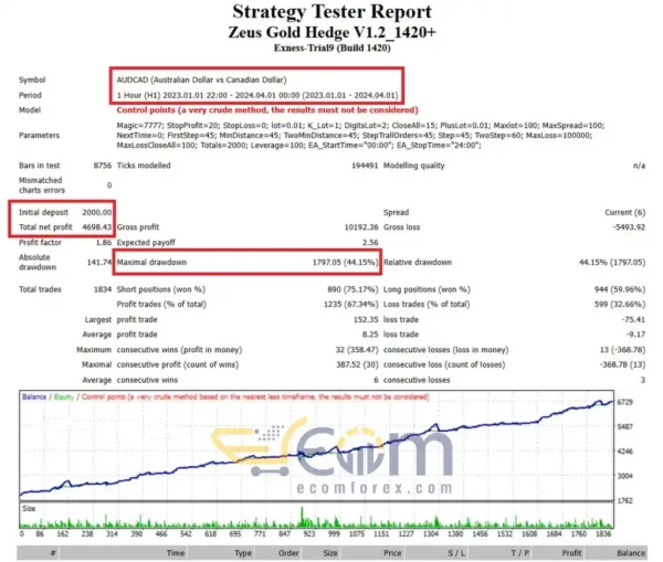 The Zeus Gold Hedge EA was tested over a 1-year period (2023) on the AUDCAD pair with an initial deposit of $3,000. The EA delivered a total net profit of $4,363.07, showcasing a profit factor of 1.78. Despite achieving strong returns, the system maintained a maximum drawdown of 35.20%, indicating moderate risk exposure.